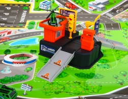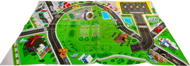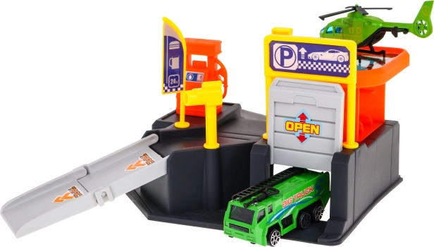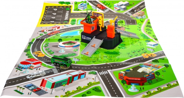 Ten kolorowy, plastikowy zestaw zamieni pokój w małe centrum komunikacyjne. Dwupoziomowy parking z rampami i lądowiskiem uzupełnia czytelna mata z miastem i drogami, po której dzieci mogą jeździć samochodzikiem i lądować helikopterem. Dzięki kompaktowym wymiarom łatwo mieści się w pokoju dziecięcym i szybko się go sprząta.