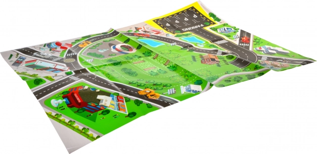 Mata o wymiarach ok. 78 × 58 cm przedstawia ulice, parkingi i budynki – idealna do nauki podstaw sytuacji drogowych.