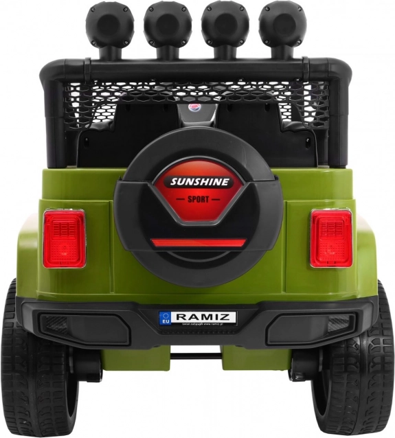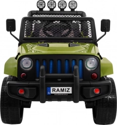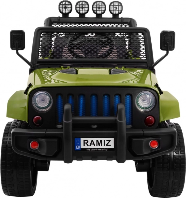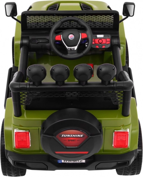 Rodzice docenią pilot 2,4 GHz z trzema prędkościami i bezpiecznym przyciskiem Stop. Wnętrze oferuje siedzisko z eko-skóry z pasami oraz bogate oświetlenie: przednie LED, górne światła na ramie oraz podświetlaną maskę z wyłącznikiem. Nie brakuje otwieranych drzwi, składanego uchwytu transportowego i praktycznego schowka w „zapasowym” kole.