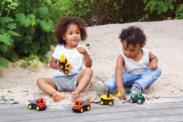 Zestaw zawiera koparkę, ładowarkę, śmieciarkę, ciągnik i wywrotkę, co zwiększa różnorodność scenariuszy zabawy.