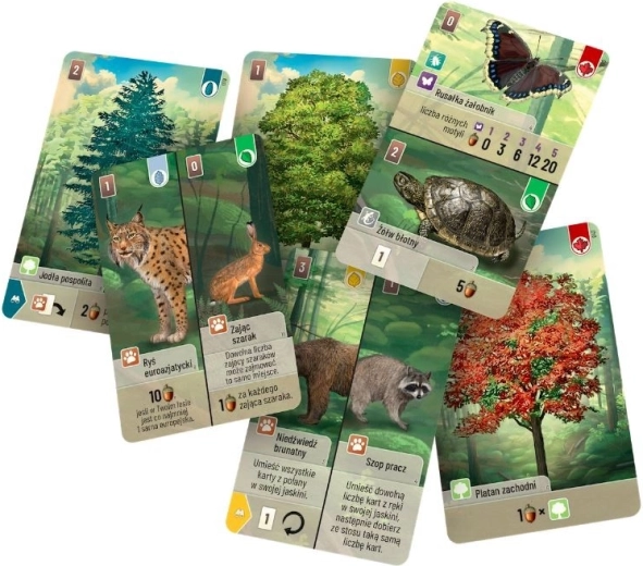Wśród kart znajdziemy drzewa i zwierzęta. Te pierwsze stanowią podstawę naszego lasu, wokół których możemy zagrywać różne gatunki. Karty zwierząt są dwustronne i za każdym razem wybieramy, której strony użyć.