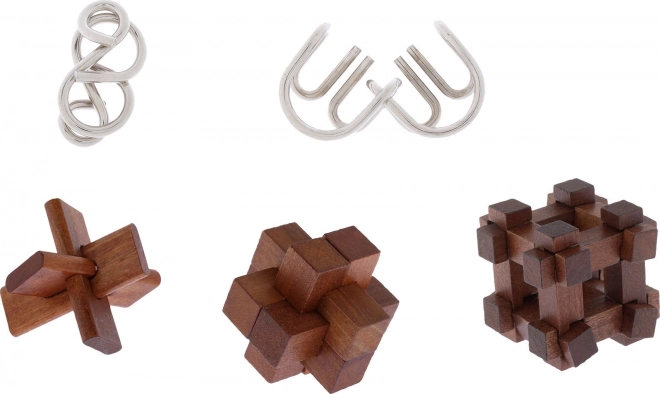 • 5 unikalnych łamigłówek – 3 drewniane i 2 metalowe