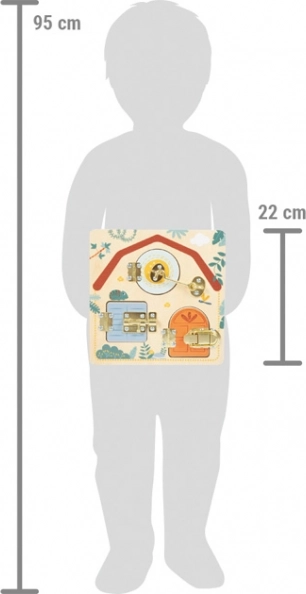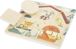 Ta wysokiej jakości drewniana tablica motoryczna w kształcie domku zapewnia dzieciom od 3 lat bezpieczne wyzwanie: otwierać, zamykać i odkrywać na nowo. Różne typy zamków, zatrzasków i klamer uczą praktycznych umiejętności życia codziennego, a zabawny design ze zwierzętami z Safari wspiera ciekawość i koncentrację.