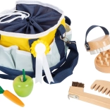 Ten wysokiej jakości zestaw do zabawy w odgrywanie ról pozwala dzieciom opiekować się ulubionym koniem jak prawdziwi opiekunowie. Torba z szerokim, ściąganym otworem utrzymuje wszystkie akcesoria w porządku, a boczne kieszenie zapewniają przejrzystość i szybki dostęp. W opakowaniu znajdziesz drewniane narzędzia do szczotkowania, czesania i czyszczenia kopyt, a także turniejową wstążkę dla uroczystej atmosfery.
