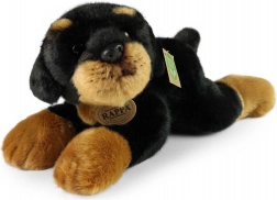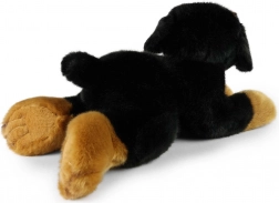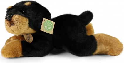 Uroczy pluszowy pies rasy Rottweiler w pozycji leżącej o długości 30 cm ucieszy dzieci i dorosłych. Ma realistyczne wykonanie, wysokiej jakości miękki plusz oraz ekologiczną wyściółkę z recyklingowanych butelek PET, która jest bezpieczna także dla najmłodszych.