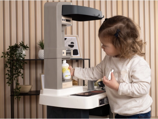 Elektroniczna kuchnia Smoby mini Tefal Studio jest wyposażona w efekty dźwiękowe, które zwiększają realizm zabawy. Zawiera kuchenkę z płytą grzewczą, okap, piekarnik, lodówkę, ekspres do kawy z kapsułkami, saturator oraz patelnię.