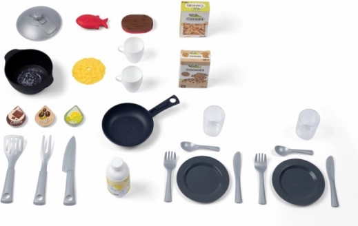 Do dodatkowych elementów należą zlew z kranem oraz 27 dodatków, takich jak sztućce, talerze, kubeczki i schowki, które zapewnią porządek podczas zabawy. Specjalne funkcje obejmują mięso i rybę z dwustronnym wzorem, wyglądające jak surowe i podsmażone, a także magiczny makaron, który wygląda jak ugotowany.