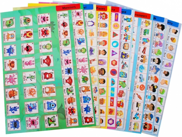 Ilustrowane karty z kategoriami (twarze, kształty, transport, rodzina, potworki) wspierają rozwój słownictwa, koncentracji i umiejętności tworzenia skojarzeń.