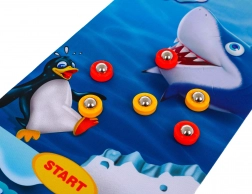 Duża, wyraźnie oznaczona mata ze startem i polami liczbowymi ułatwiającymi liczenie punktów. Motyw oceanu z pingwinami i rekinem podkreśla atmosferę gry.