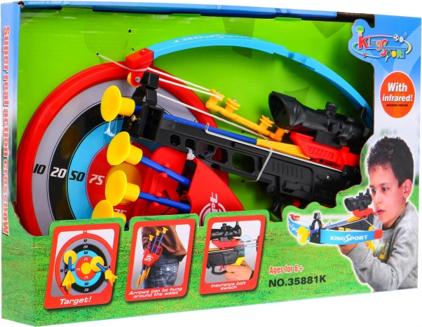 | Łuk jest naciągnięty gumą i ma podczerwony celownik dla bardziej precyzyjnego strzelania. | |