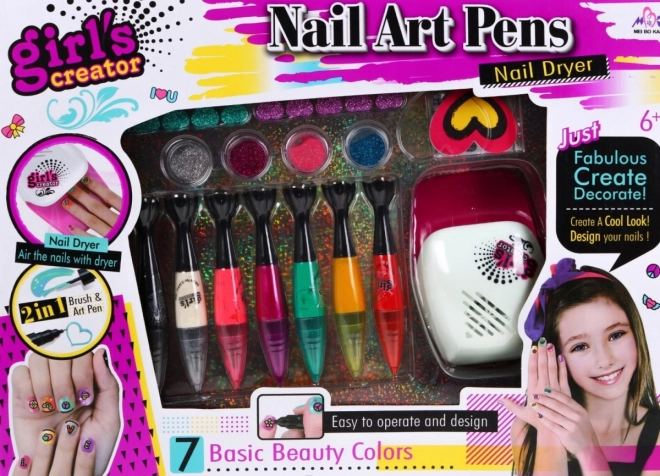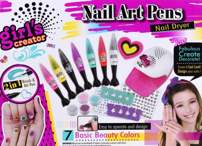 Zawiera suszarkę do paznokci zasilaną bateriami, dekoracyjne kryształki, wiele naklejek oraz inne akcesoria do nail artu.