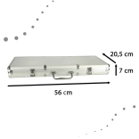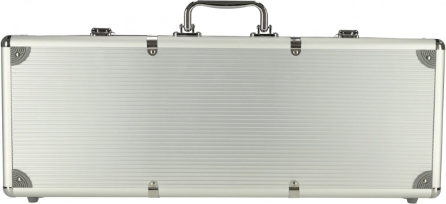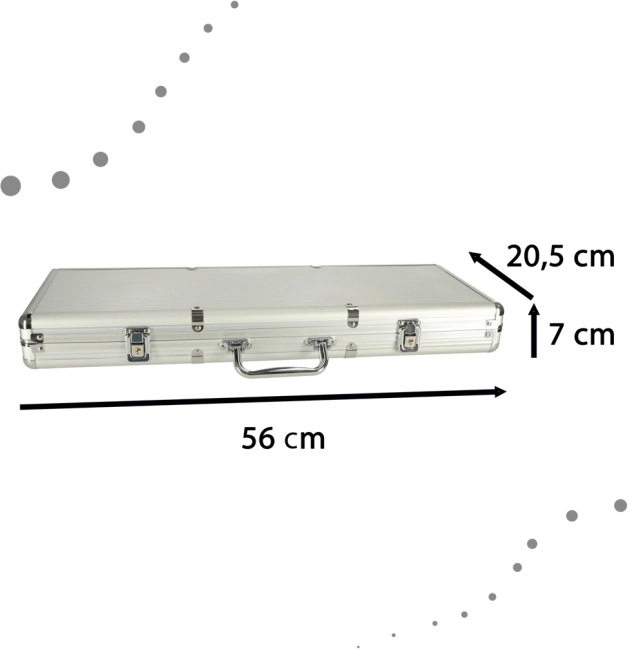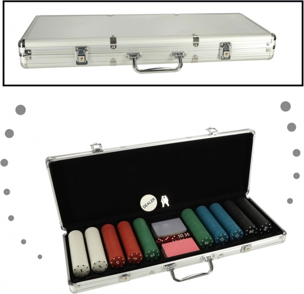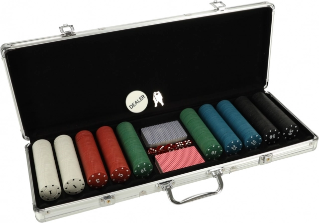 Zestaw zawiera żetony, karty i kostki do różnych wariantów gier. Srebrna walizka zapewnia bezpieczne przechowywanie komponentów oraz łatwy transport.