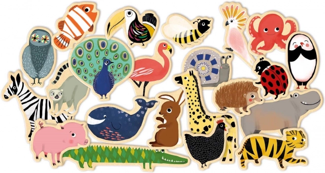 Odkryj zabawny świat pełen opowieści z drewnianymi magnesami DJECO. Zestaw zawiera 36 kolorowych magnetycznych zwierzątek z zoo, lasu i dżungli, idealnych na lodówkę lub tablicę magnetyczną. Świetne do rozwoju motoryki małej, wyobraźni oraz nauki gatunków zwierząt, odpowiednie dla dzieci od 2 lat.