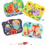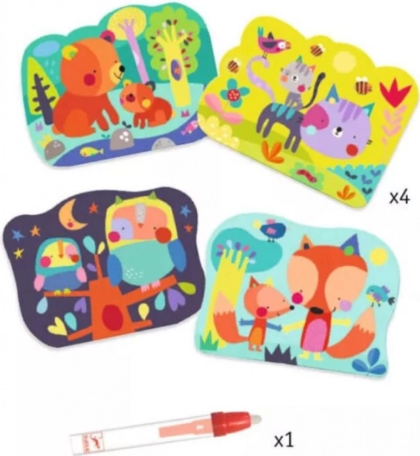 Wodne kolorowanki DJECO oferują dzieciom od 18 miesięcy proste i czyste tworzenie bez farbek. Na czterech solidnych kartach o wymiarach 21 × 26 cm po kontakcie z wodą pojawiają się urocze postacie – miś, kotek, sówka i lis. Gdy woda wyschnie, obrazek się ukrywa i zabawa może zacząć się od nowa.