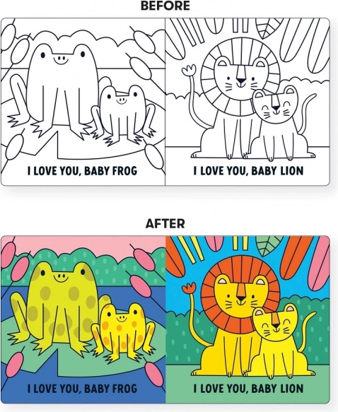Po zanurzeniu w wodzie czarno-białe ilustracje zmieniają się w żywe kolory – natychmiastowa nagroda, która motywuje dzieci do zabawy i odkrywania.
