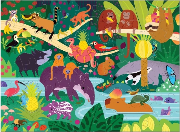 Tętniąca życiem dżungla ze zwierzętami i tropikalnymi owocami rozwija koncentrację i wyobraźnię. Idealna do wspólnego układania i nauki przez zabawę.