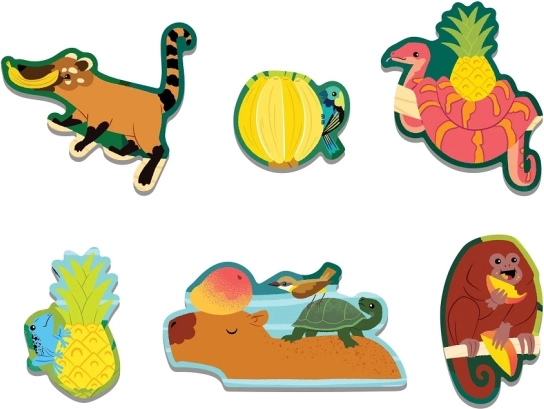Przenieś dzieci do tropikalnego raju pełnego barw, zwierząt i soczystych owoców. Pachnące puzzle z motywem owocowej dżungli rozwijają małą motorykę, koncentrację i wyobraźnię, a dzięki elementom o zapachu banana, ananasa i mango dodają układaniu przyjemnych wrażeń sensorycznych. Precyzyjne wycięcie, matowa powierzchnia i gładki spód zapewniają komfortowe układanie bez odblasków.