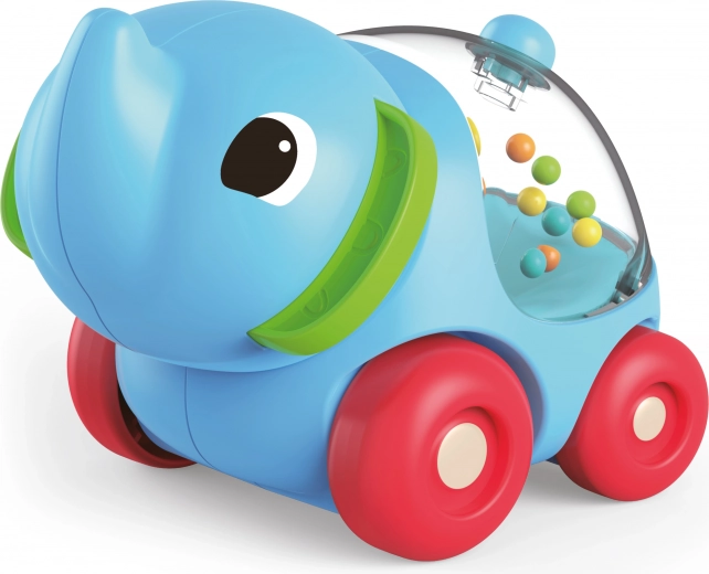 Ta kolorowa grzechotka–słonik na kółkach to idealny pierwszy pojazdzik dla maluchów. W ruchu wydaje dźwięk grzechotania, który motywuje dzieci do odkrywania, raczkowania i pierwszego popychania zabawki przed sobą.