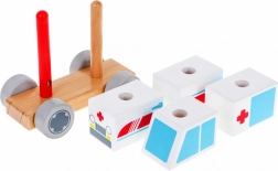 Ta drewniana karetka jest idealna do pierwszych zabaw konstrukcyjnych i motorycznych. Dzieci nakładają cztery klocki na dwa kołeczki w podstawie i składają własny pojazd ze znanymi symbolami służb ratunkowych. Sprężyste koła zapewniają płynną jazdę po podłodze i rozwijają wyobraźnię oraz tematyczną zabawę w ratownika.