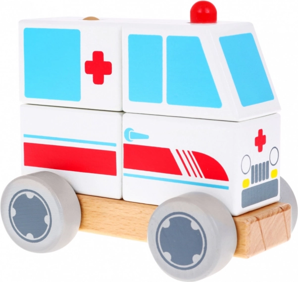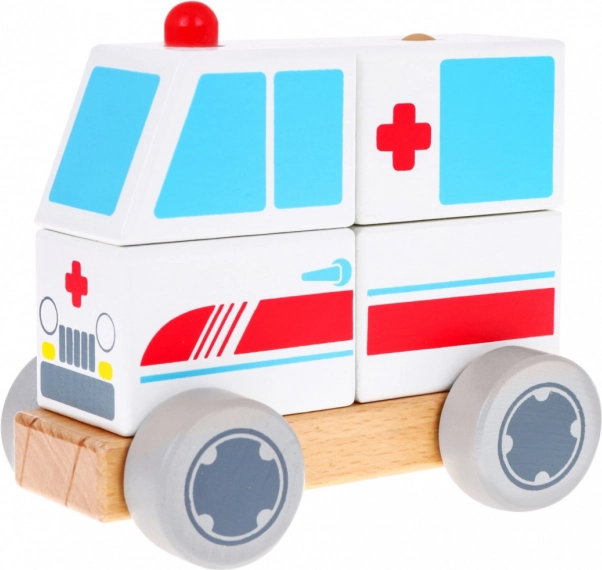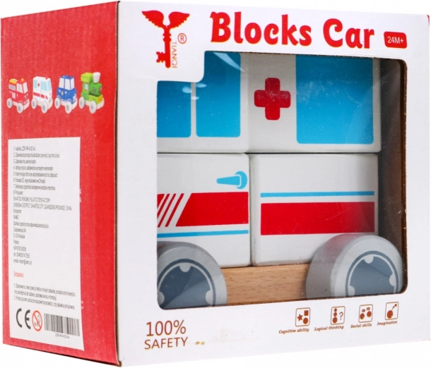 Odkryj zabawne drewniane autko karetka dla dzieci od 2 lat. Zabawka składa się z podstawy i czterech kolorowych klocków, które nakłada się na kołeczki, tworząc pojazd. Dzięki ruchomym kółkom karetka jest w pełni jezdna i wspiera motorykę małą, koordynację ręka–oko oraz myślenie logiczne. Wszystkie elementy są z drewna i malowane nietoksycznymi farbami.