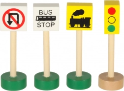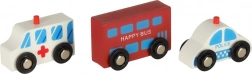 Ten drewniany zestaw umożliwia dzieciom tworzenie własnego miasta z różnymi pojazdami i budynkami.
