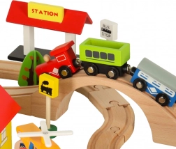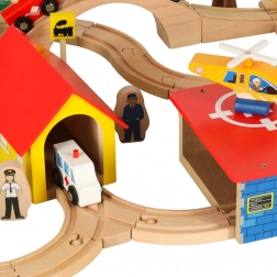 Odkryj nieograniczone możliwości z tym kolorowym drewnianym zestawem pociągów. Zestaw zawiera stację, mosty, lądowisko dla helikoptera, figurki i inne elementy, które pozwalają stworzyć własne miasteczko.