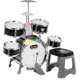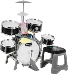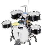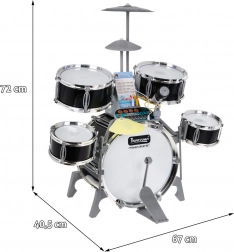 Multifunkcyjny dziecięcy zestaw perkusyjny zawiera 5 bębnów, 2 elektroniczne talerze (plastikowe) i jeden metalowy talerz, panel sterowania, mikrofon, 2 pałeczki oraz 6 kart z nutami do łatwej nauki gry. Zestaw jest zasilany trzema bateriami AA lub przewodem USB.