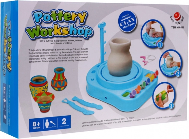 | - podstawa garncarska z kołem, - 2x narzędzia rzeźbiarskie, - stojak, - linijka z uchwytami, - 6 różnych kolorów farb, - 2 x pędzelek, - 2 x glina, łącznie 800 g | |