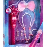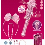 Interaktywny zestaw dla małych księżniczek - wróżek oferuje dzieciom od 3 lat magiczne doświadczenia dzięki magicznej różdżce z efektami dźwiękowymi i świetlnymi, wraz ze stylową opaską z piękną kokardą, naszyjnikiem, bransoletką, kolczykami i pierścionkami.