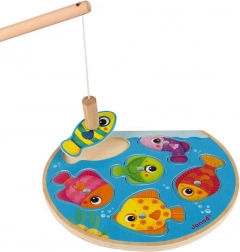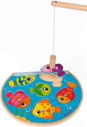 Zabawna drewniana magnetyczna układanka dla małych wędkarzy. Za pomocą magnetycznej wędki dzieci łowią i odkładają elementy na właściwe miejsca. Zawiera 6 kolorowych rybek i 1 wędkę, rozwija małą motorykę, koordynację ręka–oko oraz rozpoznawanie kolorów i kształtów. Odpowiednia od 12 miesięcy.