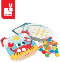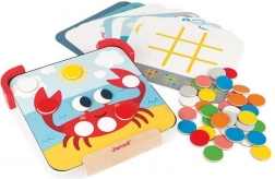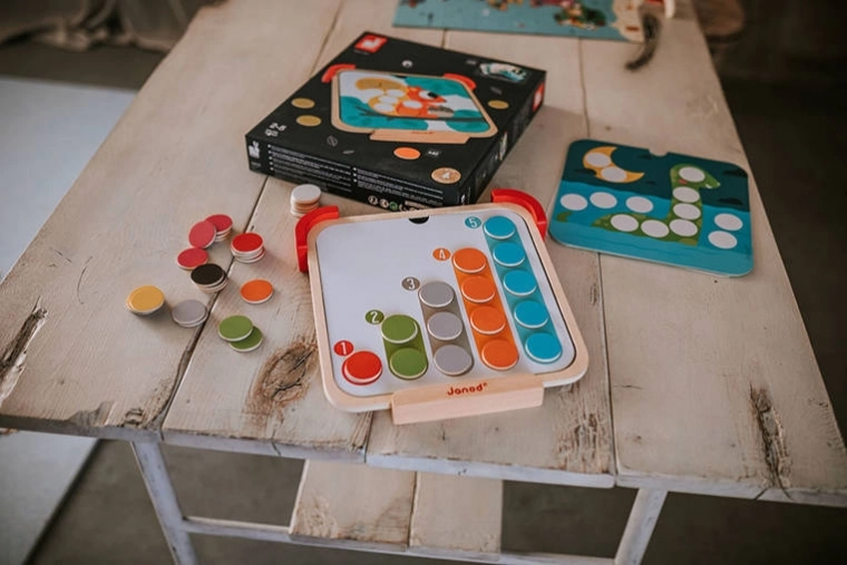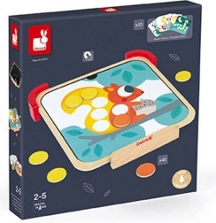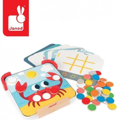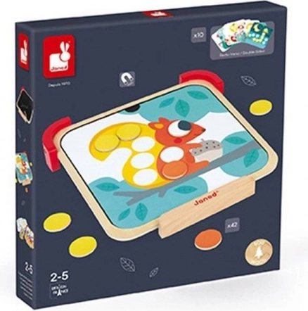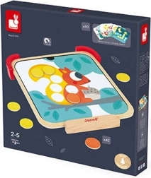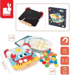 Magnetyczna gra edukacyjna Uczę się kolorów od marki JANOD oferuje wszechstronną aktywność dla małych odkrywców. W zestawie znajduje się drewniana magnetyczna tablica z podstawkami, 42 kolorowe magnetyczne kółka, 10 dwustronnych kart z zadaniami oraz kreda. Dzieci umieszczają magnesy we właściwych miejscach według wzorów, ćwicząc kolory, układy i koncentrację – a tablicę mogą wykorzystać również do rysowania oraz pierwszych prób pisania liter i cyfr.