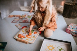 Dzieci układają kolorowe kółka według wzorów z kart, trenują rozpoznawanie kolorów, wzorów i koncentrację – w przyjemny, bezstresowy sposób.