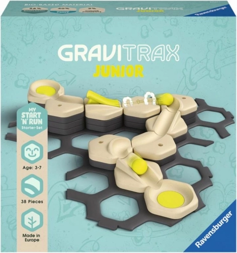 GraviTrax Junior – zestaw startowy to idealne wprowadzenie do świata torów kulkowych dla dziewczynek i chłopców od 3 lat. Dzięki dużym, łatwym do chwytania elementom dzieci bezpiecznie i z radością budują własne trasy, które mogą dodatkowo kreatywnie dekorować i tworzyć tematyczne światy.