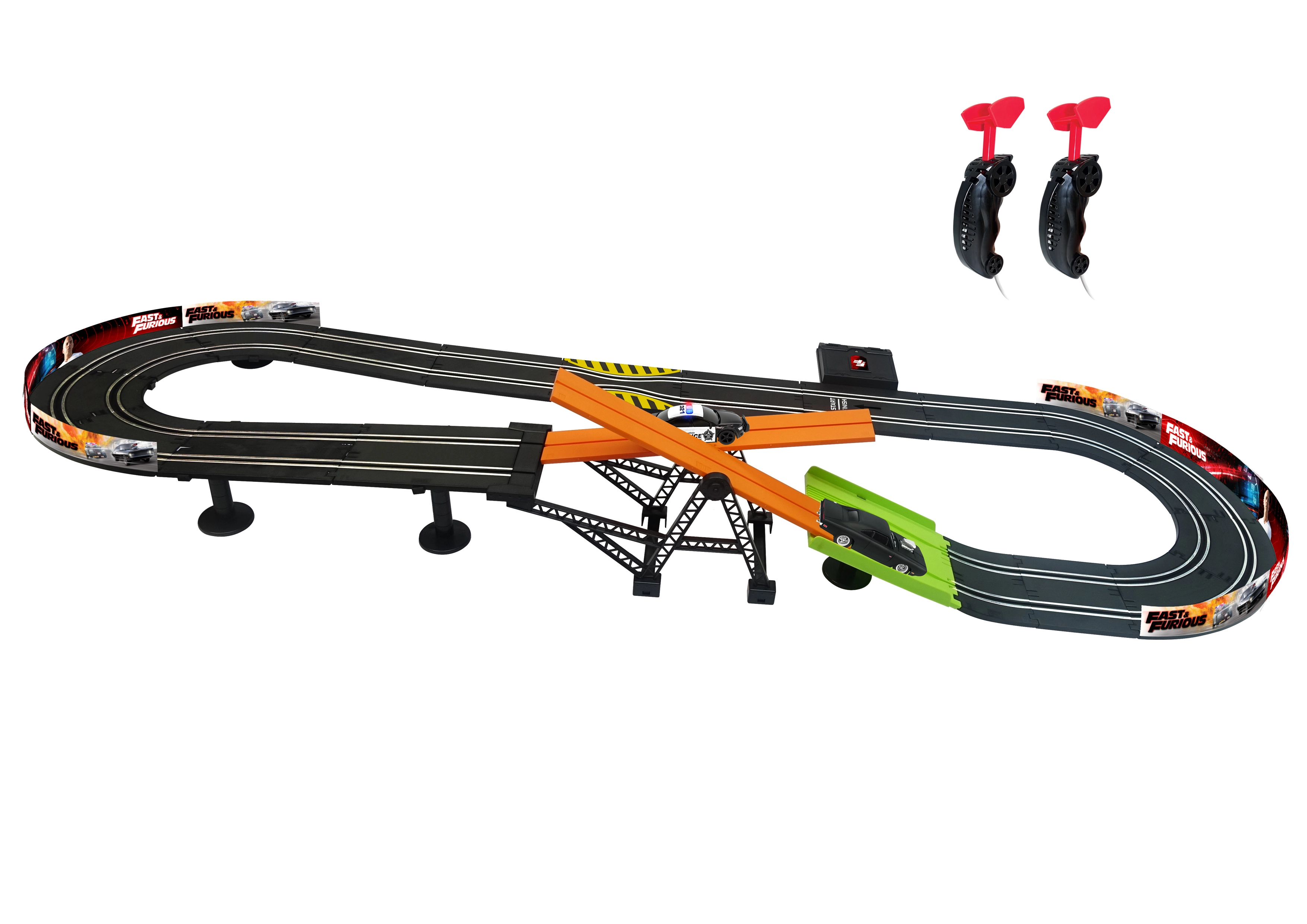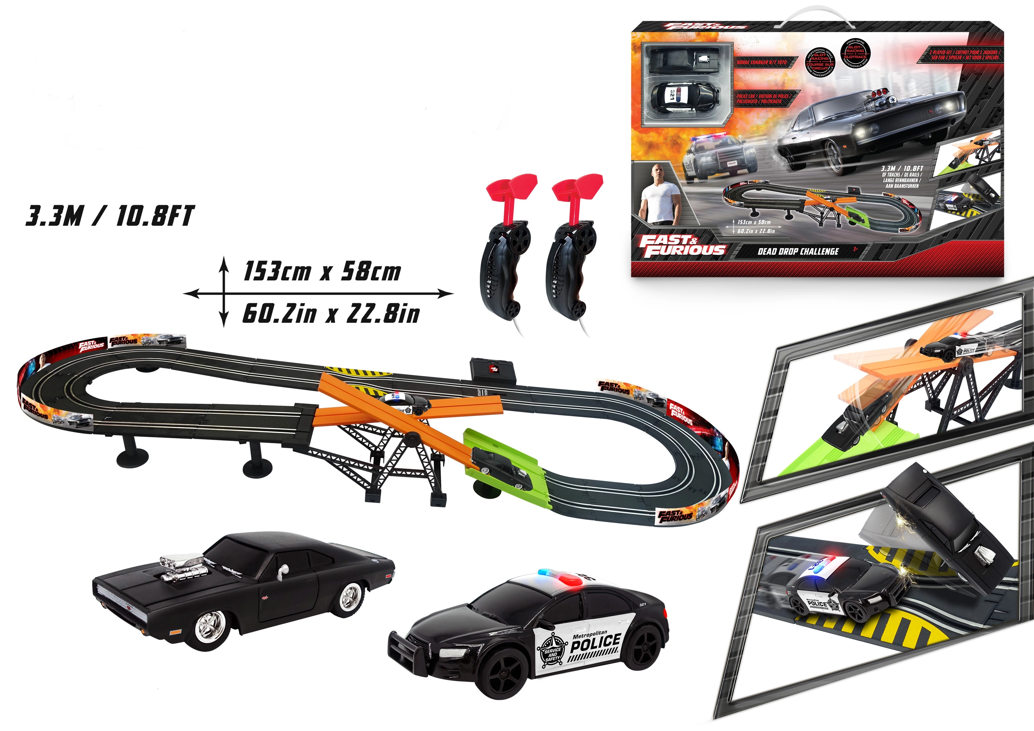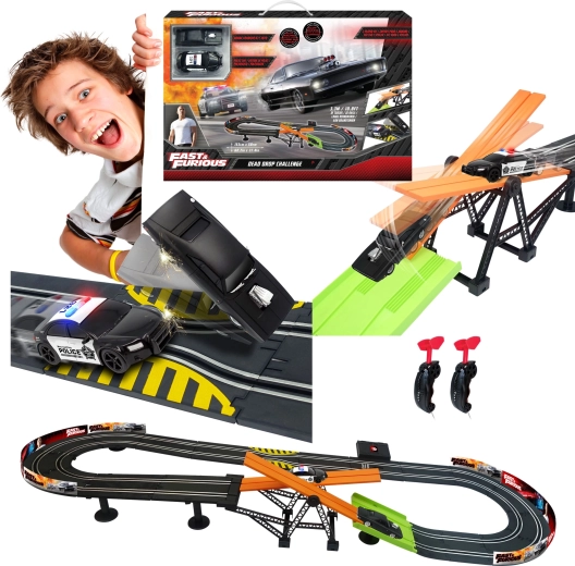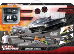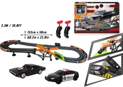 Autodroga z przeszkodą Szybcy i wściekli. Długość toru 3,3 m. Wymiary 153×58 cm. 2 auta w zestawie. 6×AA do pojemnika na baterie nie są dołączone. Instrukcja montażu w zestawie.