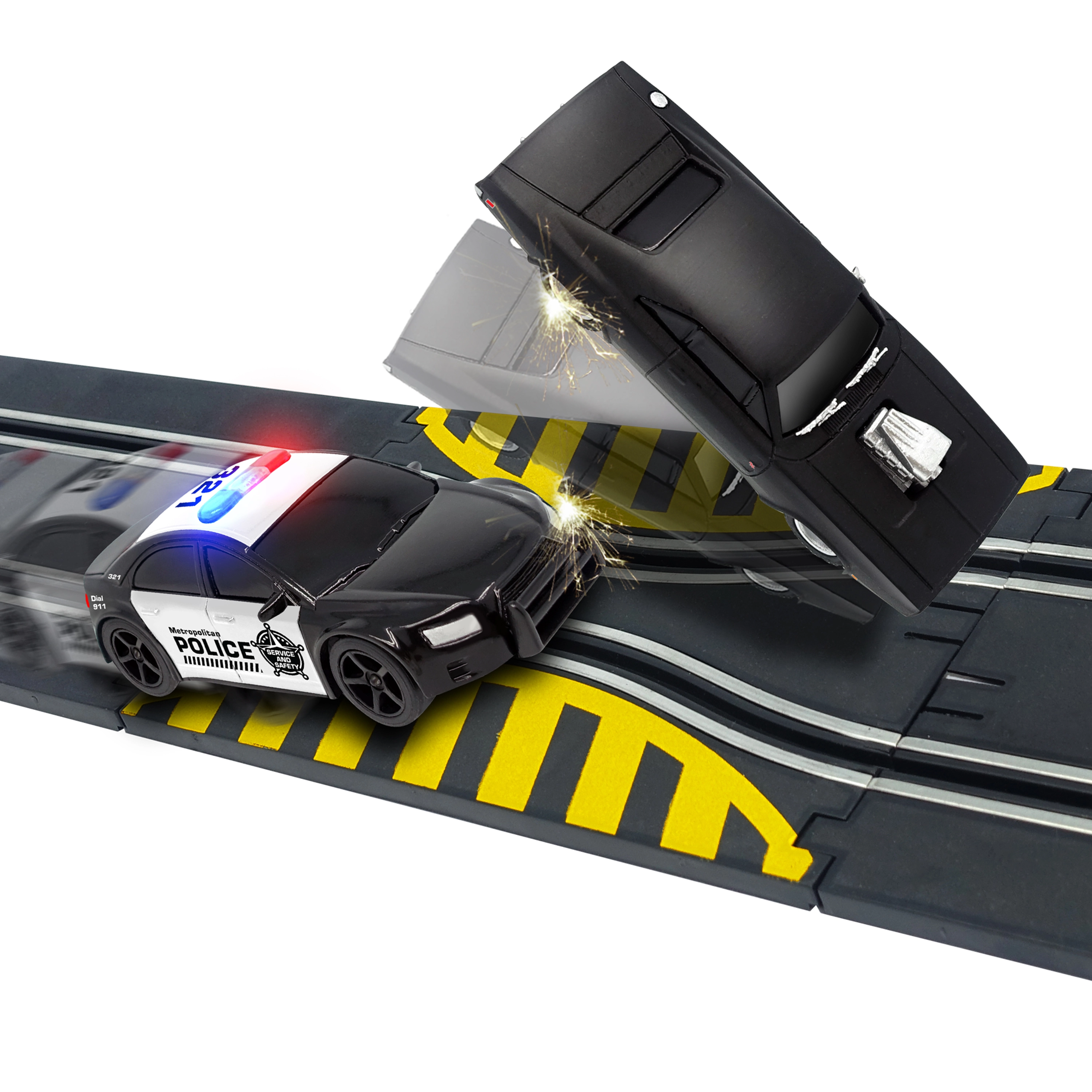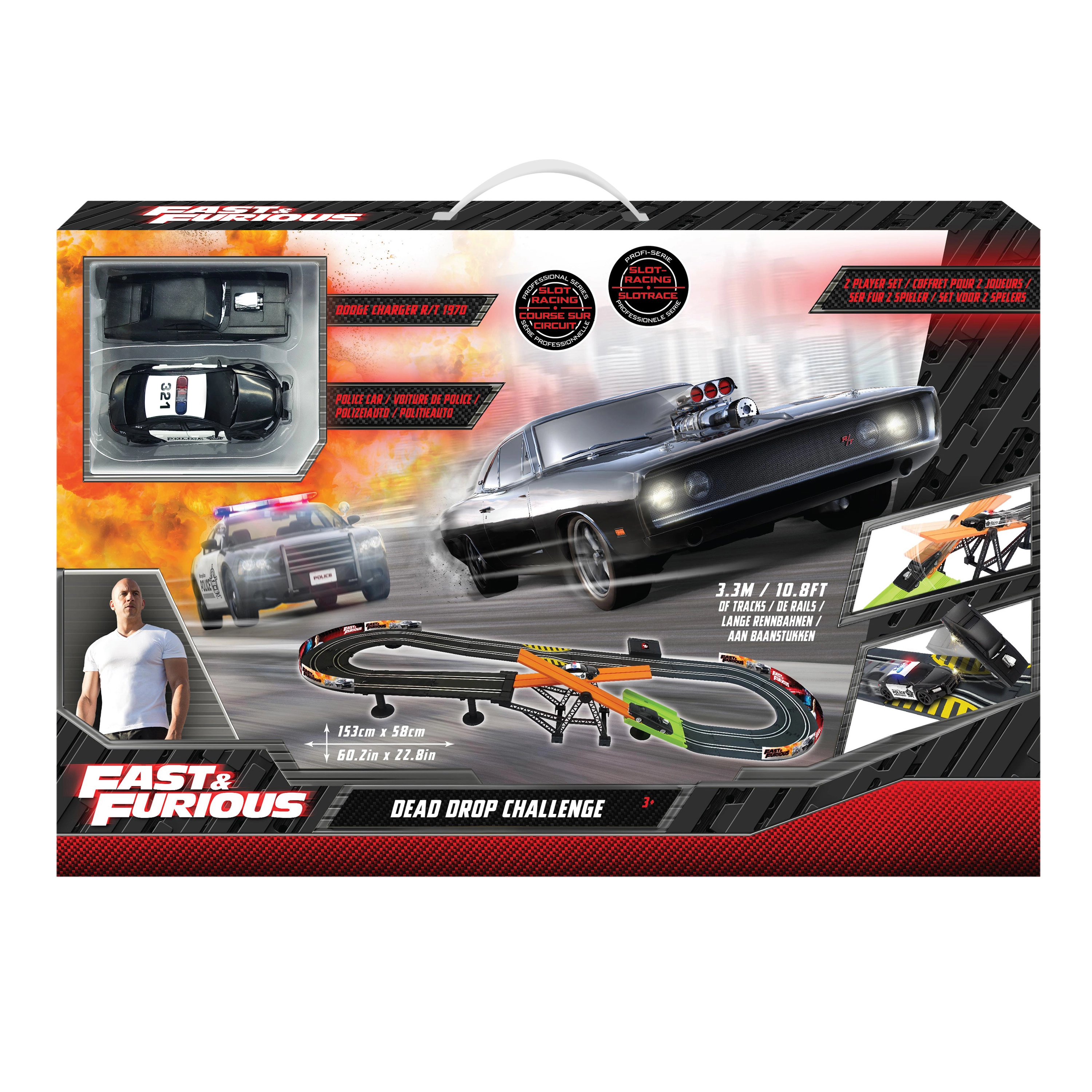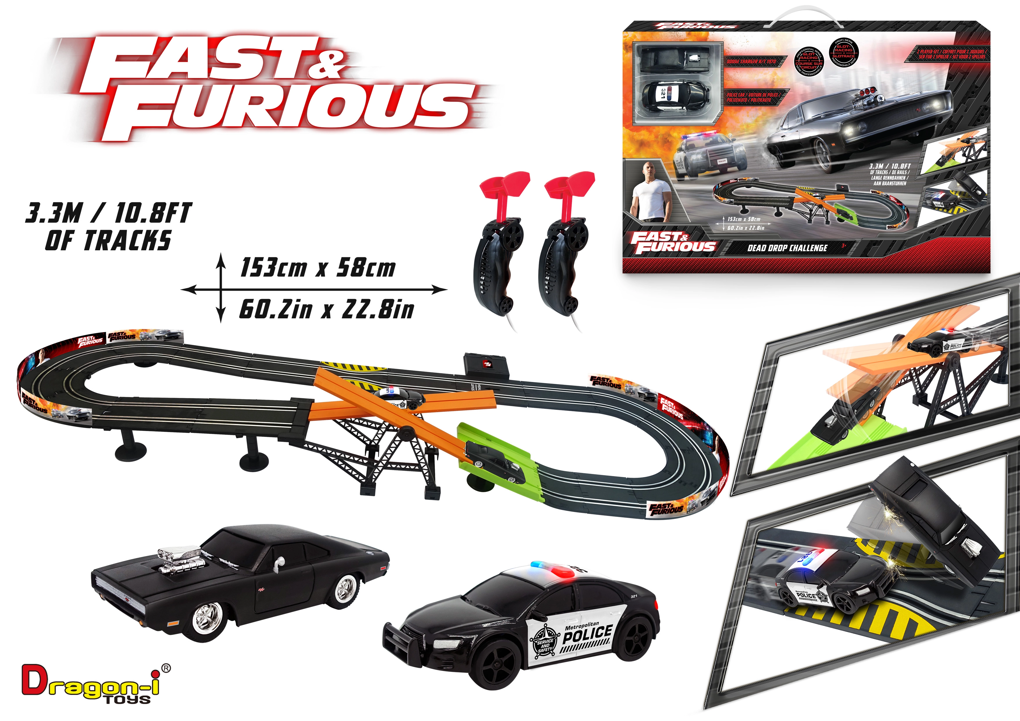 Autodroga z przeszkodą Szybcy i wściekli. Długość toru 3,3 m. Wymiary 153×58 cm. 2 auta w zestawie. 6×AA do pojemnika na baterie nie są dołączone. Instrukcja montażu w zestawie.