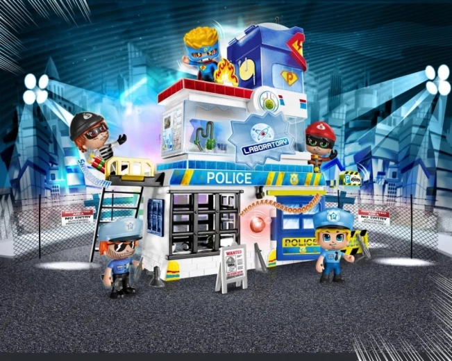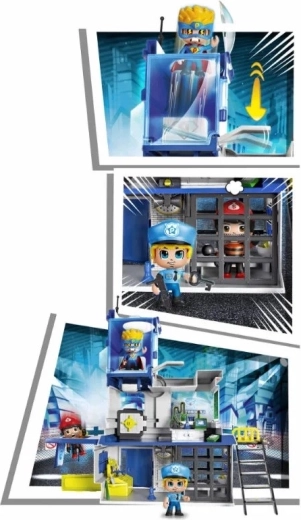 Realistyczna posterunkowa stacja z pomieszczeniami, drabinkami i drzwiami zachęca dzieci do swobodnego opowiadania historii i tworzenia własnych misji.