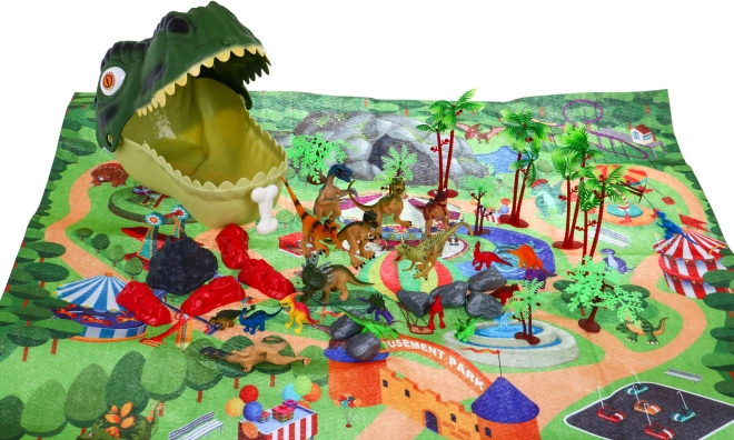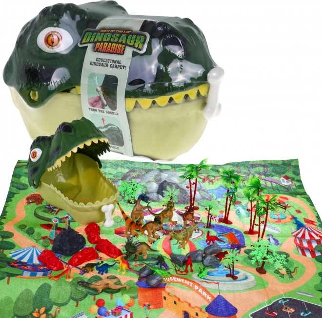 Ten zabawny i edukacyjny zestaw zachwyci wszystkich małych paleontologów. Duża plastikowa głowa dinozaura służy jako pojemnik z wysuwanym uchwytem, dzięki czemu dzieci mogą łatwo zabrać cały świat ze sobą. W środku znajdziesz filcową matę do zabawy z motywem parku oraz barwną kolekcję gumowych figurek dinozaurów, drzew, skał i wulkanu do realistycznych scenek.