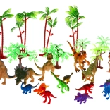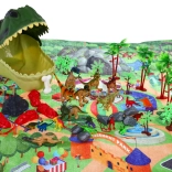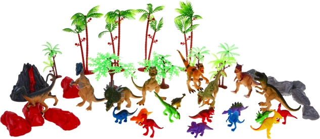 Figurki dinozaurów w różnych rozmiarach, drzewa, skały, kamienie i wulkan pozwalają tworzyć autentyczne prehistoryczne sceny i opowieści.