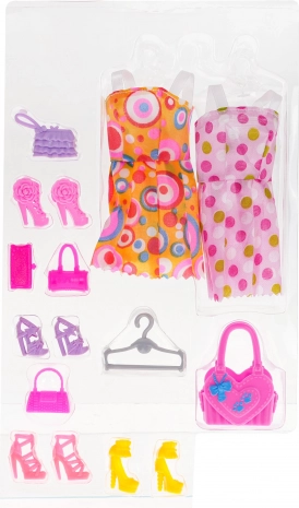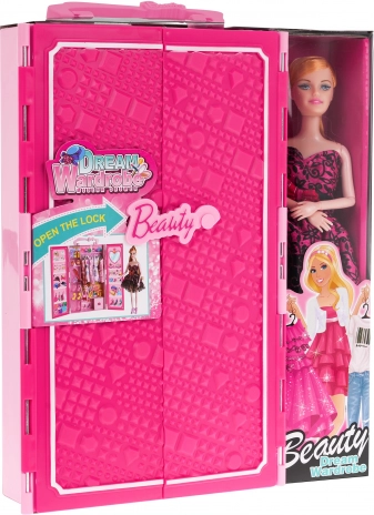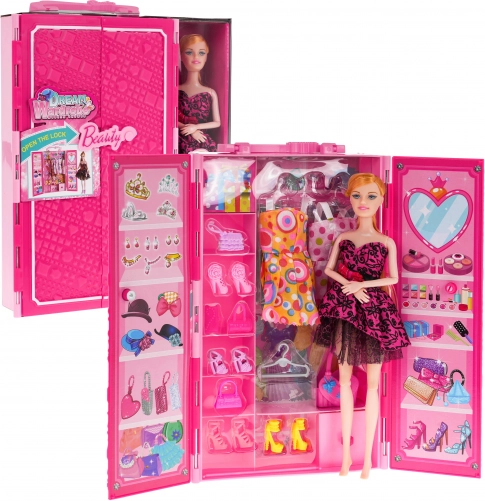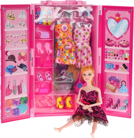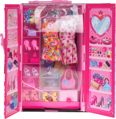 W zestawie znajduje się lalka w wyjściowej sukience oraz bogate wyposażenie: 2 sukienki, 5 torebek, 4 pary butów, 3 wieszaki i pudełko na drobiazgi. Szafkę można otworzyć szerzej, aby lepiej wyeksponować i uporządkować ubranka.