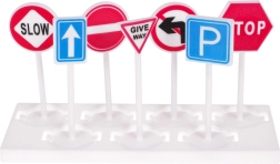- elementy konstrukcyjne parkingu, mata do zabawy, 2 metalowe autka, helikopter, 7 znaków drogowych, dekoracyjne naklejki, instrukcja obrazkowa