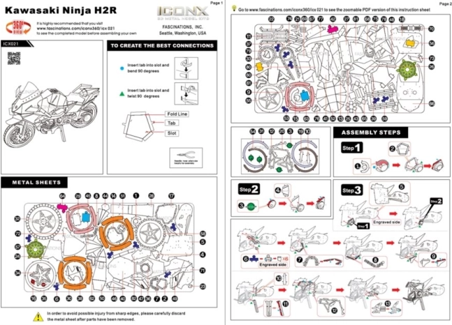 Poszczególne elementy wyjmij z metalowych arkuszy; w razie potrzeby użyj małych cążek do cięcia (brak w zestawie). Elementy łączy się za pomocą zamków tworzonych przez zaczep (języczek) i otwór. Języczek zegnij przy pomocy małych, cienkich szczypiec (brak w zestawie) i stopniowo połącz wszystkie zamki, aż powstanie bardzo realistyczne, mistrzowskie dzieło!
