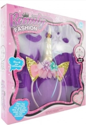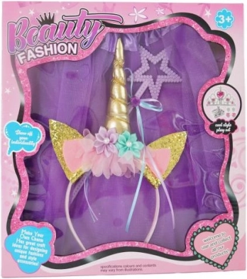 Uroczy zestaw do przebierania ucieszy każdą małą miłośniczkę jednorożców. Puszysta spódniczka tutu w delikatnym fiolecie, wygodna opaska z rogiem zdobiona kwiatuszkami i błyszczącymi uszkami oraz lekka różdżka z gwiazdką w mgnieniu oka stworzą idealny bajkowy strój.