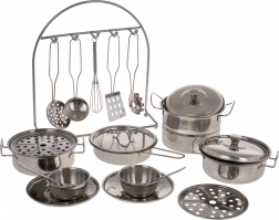 - Duży garnek; 2× mniejszy garnek; patelnia; 2× miska; 2× wkład do pary; 2× wypukła pokrywka; 1× płaska pokrywka; 2× talerz; 2× łyżeczka do herbaty; stojak z haczykami; łyżka cedzakowa; chochla; trzepaczka; łyżka do makaronu; łopatka z otworami; fartuch; rękawica; podkładka pod garnek