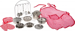 Ten bogaty zestaw kuchenny zapewnia dzieciom autentyczne wrażenia z gotowania. Metalowe garnki, pokrywki i patelnia wyglądają i brzmią jak prawdziwe, dzięki czemu zabawa w kucharza jest jeszcze ciekawsza. W komplecie znajduje się także stylowy fartuch z rękawicą w czerwono-białą kratkę dla bezpieczniejszej i czystszej zabawy.