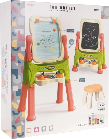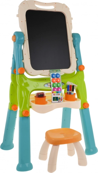 Porządek i wszystko pod ręką: półka na akcesoria, 2 kubeczki, magnetyczna gąbka oraz taboret dla wygodnego siedzenia i skupionej twórczości.