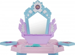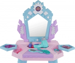 Toaletka w pastelowych kolorach stanie się piękną ozdobą dziecięcego pokoju i wesprze zabawy w odgrywanie ról, kreatywność oraz małą motorykę. Po naciśnięciu przycisku w dolnej części lustra zapalają się światła i pojawiają się księżniczki w towarzystwie melodii. Dziecięca suszarka wydaje dźwięk i daje lekki strumień powietrza, dzięki czemu zabawa w fryzjerkę jest jeszcze bardziej realistyczna.