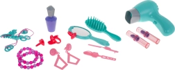 W zestawie bezpieczna suszarka na 1× AA, która delikatnie dmucha i wydaje realistyczne dźwięki – idealna do zabawy w salon fryzjerski.