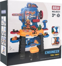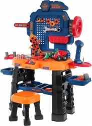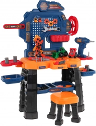 Ten kolorowy zestaw warsztatowy zamieni pokój dziecka w prawdziwy mini warsztat. Solidny stół roboczy z półkami i organizerem uzupełnia wygodny stołek oraz wkrętarka na baterie (2× AA, brak w zestawie). Dzieci mogą wkręcać, wiercić i składać własne projekty, w tym dwa pojazdy budowlane – ładowarkę i wywrotkę.