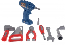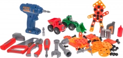 W zestawie znajduje się szeroki wybór narzędzi: wkrętarka z bitami, piła, młotek, śrubokręt, klucze, szczypce, dziesiątki śrub, kołków i podkładek oraz koła zębate do pierwszego zapoznania z mechaniką. Dzięki dużej liczbie elementów i paneli kształtowych dzieci poćwiczą cierpliwość, logikę i koordynację.