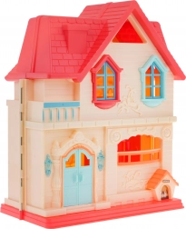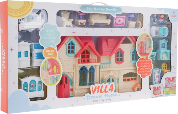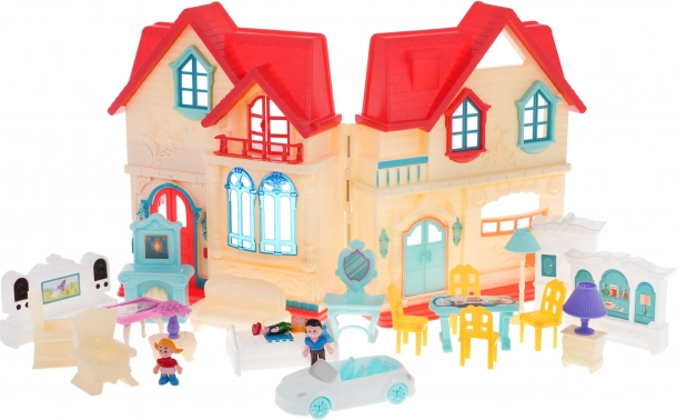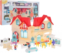 W zestawie znajduje się bogaty komplet akcesoriów: meble do salonu, sypialni i kuchni, dekoracje, samochód z ruchomymi kołami oraz trzy figurki (mama, tata, dziecko). Dzięki łatwemu rozkładaniu i otwieranym drzwiom zabawa jest przejrzysta i wygodna.